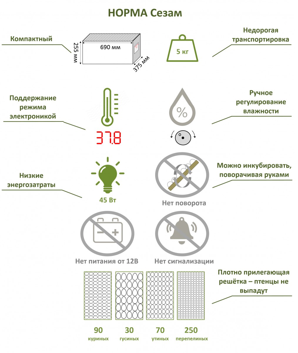 Беспрецедентная стоимость в сочетании с отличным выполнением своих функций. Норма Сезам станет ещё одной «рабочей лошадкой» в вашем хозяйстве. Выводной по предназначению, Сезам может использоваться и для полноценной инкубации. Вам нужно лишь вручную осуществлять поворот яиц.