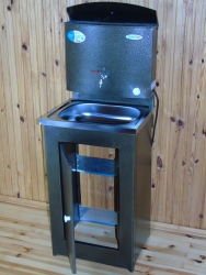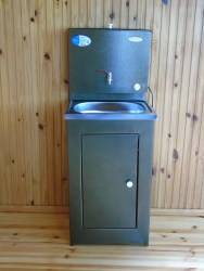 Тумба умывальника выполнена из высококачественной стали 0,7 мм, окрашена прочной краской в цвет бронза . Конструкция умывальник сборная, состоит из тумбы с дверцей, раковины и бака с металлическим краном. Бак обработан гальваническим цинковым покрытием, которое обеспечивает долговечность изделия и исключает появление ржавчины.